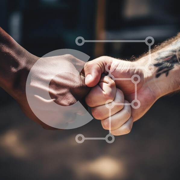 Υπάρχει δυνατότητα προσωποποίησης με δική σας φωτογραφία και προσαρμογής διαστάσεων κατόπιν παραγγελίας. Το συγεκεριμενο puzzle παρουσιαζει Η εικόνα παρουσιάζει δύο χέρια που συνδέονται με μια γροθιά. Το ένα χέρι είναι πιο σκούρο στον τόνο του δέρματος ενώ το άλλο είναι πιο ανοιχτό, συμβολίζοντας την ενότητα και τη φιλία σε διαφορετικά υπόβαθρα. Τα χέρια εμφανίζονται σε κοντινό πλάνο, δίνοντας έμφαση στη χειρονομί