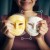 Υπάρχει δυνατότητα προσωποποίησης με δική σας φωτογραφία και προσαρμογής διαστάσεων κατόπιν παραγγελίας. Το συγεκεριμενο puzzle παρουσιαζει Η εικόνα απεικονίζει μια γυναίκα που κρατά δύο κίτρινες και λευκές μάσκες με χαμογελαστά πρόσωπα. Η μάσκα τοποθετείται στην αριστερή πλευρά του προσώπου της γυναίκας, ενώ αυτή στη δεξιά πλευρά είναι στραμμένη μακριά από την κάμερα. Μπορεί να συναχθεί ότι υπάρχουν δύο άτομα στη