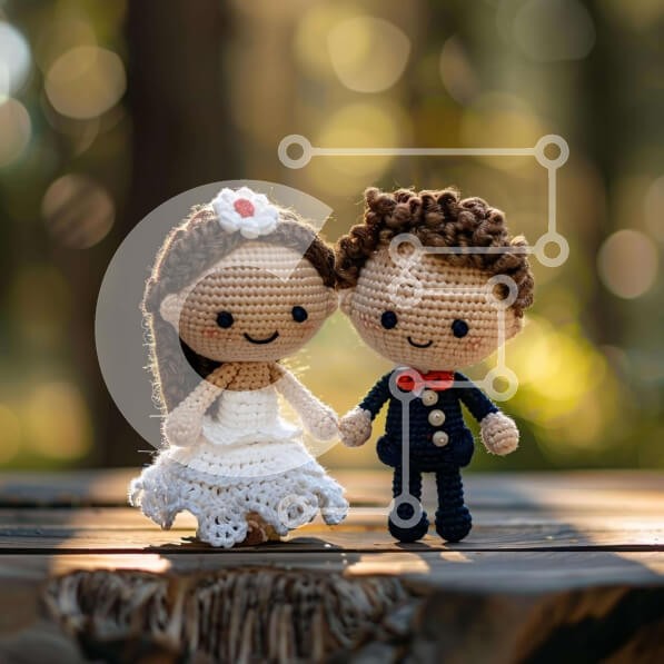Υπάρχει δυνατότητα προσωποποίησης με δική σας φωτογραφία και προσαρμογής διαστάσεων κατόπιν παραγγελίας. Το συγεκεριμενο puzzle παρουσιαζει Στην εικόνα απεικονίζονται δύο κροσέ κούκλες, μια νύφη και ο γαμπρός, που κρατιούνται χέρι-χέρι ενώ κάθονται σε ένα άγνωστο κομμάτι ξύλου. Φαίνονται να είναι ντυμένοι με παραδοσιακή νυφική, υποδηλώνοντας ότι το ζευγάρι είναι αρραβωνιασμένο ή πρόσφατα παντρεμένο. Επιπλέον, μπορ