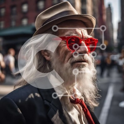Υπάρχει δυνατότητα προσωποποίησης με δική σας φωτογραφία και προσαρμογής διαστάσεων κατόπιν παραγγελίας. Το συγεκεριμενο puzzle παρουσιαζει Η εικόνα απεικονίζει έναν ηλικιωμένο άνδρα με γένια και μακριά λευκά μαλλιά να στέκεται στο δρόμο. Φοράει κόκκινα γυαλιά ηλίου, τα οποία φαίνεται ως μέρος της ενδυμασίας του. Αρκετοί άλλοι άνθρωποι περπατούν στη σκηνή, υποδηλώνοντας ένα πολυσύχναστο αστικό περιβάλλον. Ένα μον