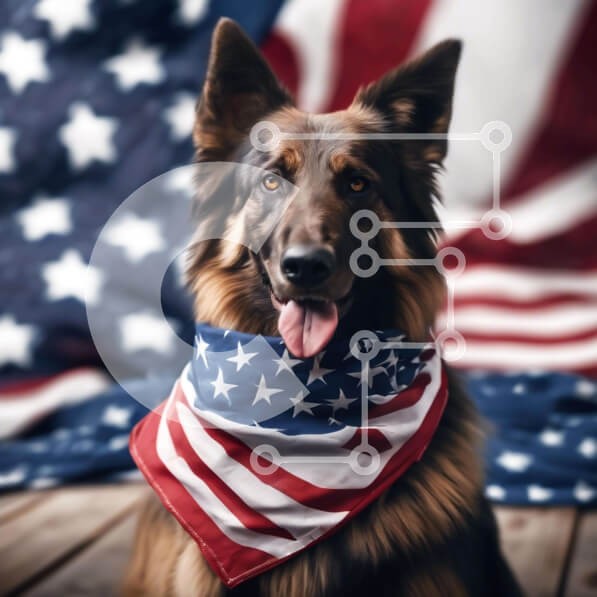 Υπάρχει δυνατότητα προσωποποίησης με δική σας φωτογραφία και προσαρμογής διαστάσεων κατόπιν παραγγελίας. Το συγεκεριμενο puzzle παρουσιαζει Ένας γερμανικός ποιμενικός σκύλος που φορά μια μπαντάνα με αμερικανική σημαία που κάθεται μπροστά από ένα φόντο αμερικανικής σημαίας. Ο σκύλος χαμογελά στην κάμερα, απολαμβάνοντας χρόνο με τον ιδιοκτήτη του. Η εικόνα αντικατοπτρίζει το πνεύμα του εορτασμού της 4ης Ιουλίου. Έν