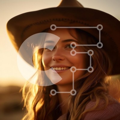 Υπάρχει δυνατότητα προσωποποίησης με δική σας φωτογραφία και προσαρμογής διαστάσεων κατόπιν παραγγελίας. Το συγεκεριμενο puzzle παρουσιαζει Η εικόνα δείχνει μια γυναίκα να χαμογελά ζεστά, φορώντας ένα μεγάλο καουμπόικο καπέλο με φόντο το ηλιοβασίλεμα. Το χρυσό φως ενισχύει τα χαρακτηριστικά της και δημιουργεί μια απαλή λάμψη γύρω της. Τα μακριά, κυματιστά μαλλιά της πέφτουν σε καταρράκτη, πλαισιώνοντας όμορφα το π