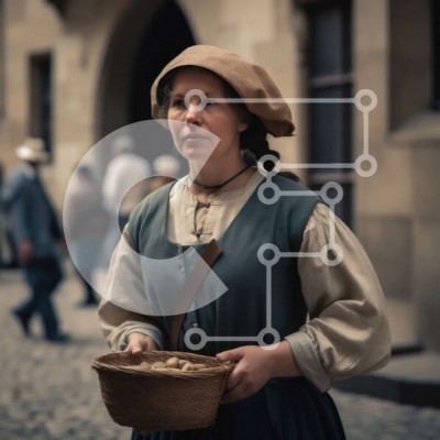 Υπάρχει δυνατότητα προσωποποίησης με δική σας φωτογραφία και προσαρμογής διαστάσεων κατόπιν παραγγελίας. Το συγεκεριμενο puzzle παρουσιαζει Αυτή η εικόνα είναι μιας γυναίκας ντυμένης με ρούχα εποχής, που κρατά ένα καλάθι με ψωμί. Φαίνεται να στέκεται έξω, ίσως σε μια αγορά ή ένα αρτοποιείο. Η γυναίκα κοιτάζει κατευθείαν την κάμερα και η εστίαση είναι στο πρόσωπό της και στο καλάθι με το ψωμί που κρατά. Το φόντο εί
