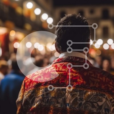 Υπάρχει δυνατότητα προσωποποίησης με δική σας φωτογραφία και προσαρμογής διαστάσεων κατόπιν παραγγελίας. Το συγεκεριμενο puzzle παρουσιαζει Αυτή η εικόνα απεικονίζει έναν άνδρα να στέκεται μπροστά σε ένα πλήθος σε ένα φεστιβάλ ή μια αγορά. Φοράει ένα σακάκι σε έντονα χρώματα με φλοράλ μοτίβο που στολίζεται με χάντρες και πούλιες. Το πλήθος είναι πολυσχιδές, αποτελείται από άτομα διαφόρων ηλικιών και εθνοτήτων, ντυ