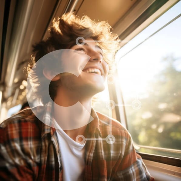 Υπάρχει δυνατότητα προσωποποίησης με δική σας φωτογραφία και προσαρμογής διαστάσεων κατόπιν παραγγελίας. Το συγεκεριμενο puzzle παρουσιαζει Αυτή η εικόνα παρουσιάζει έναν νεαρό άνδρα με σγουρά μαλλιά που φορά ένα καρό πουκάμισο. Διακρίνεται να χαμογελά και να κοιτάζει έξω από το παράθυρο ενός τρένου, φαινομενικά να απολαμβάνει τη θέα. Η φωτογραφία αποτυπώνει τη χαρά και τον ενθουσιασμό του ταξιδιού. Ένα μοναδικό