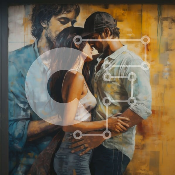 Υπάρχει δυνατότητα προσωποποίησης με δική σας φωτογραφία και προσαρμογής διαστάσεων κατόπιν παραγγελίας. Το συγεκεριμενο puzzle παρουσιαζει Αυτή η εικόνα δείχνει έναν άνδρα και μια γυναίκα να αγκαλιάζονται μπροστά από μια μεγάλη, πολύχρωμη τοιχογραφία. Ο άνδρας φοράει καπέλο του μπέιζμπολ και λευκό μπλουζάκι, ενώ η γυναίκα μαύρο φανελάκι και τζιν μπουφάν. Η τοιχογραφία αποτελείται από διάφορα γεωμετρικά σχήματα κα