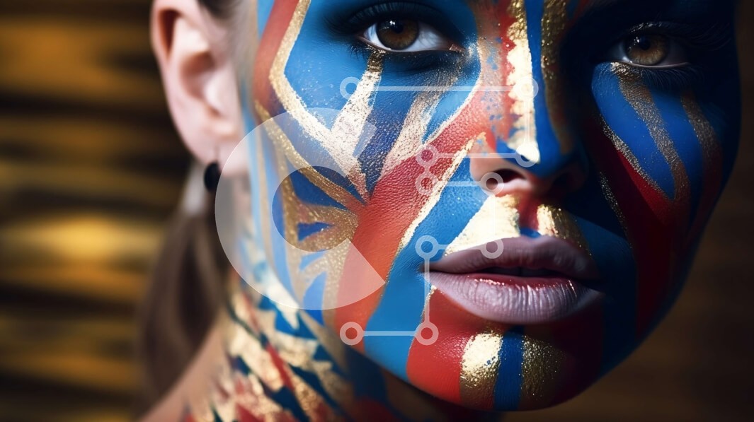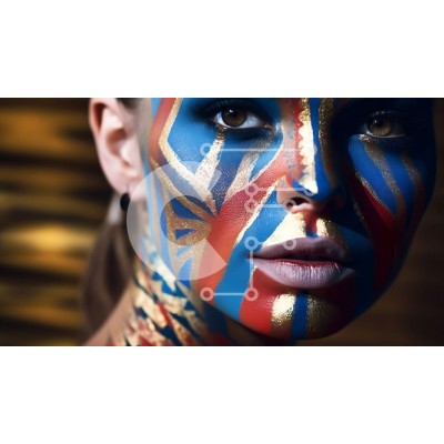 Υπάρχει δυνατότητα προσωποποίησης με δική σας φωτογραφία και προσαρμογής διαστάσεων κατόπιν παραγγελίας. Το συγεκεριμενο puzzle παρουσιαζει Ένα κοντινό πλάνο μιας γυναίκας με εντυπωσιακή βαφή προσώπου σε ζωηρά μπλε, κόκκινα και χρυσά μοτίβα. Τα περίπλοκα σχέδια καλύπτουν το πρόσωπο και το λαιμό της, δημιουργώντας μια καλλιτεχνική έκφραση. Το φόντο διαθέτει απαλούς, θολούς τόνους που ενισχύουν την εστίαση στο πολύχ