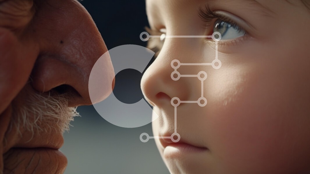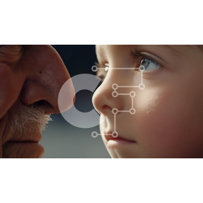 Υπάρχει δυνατότητα προσωποποίησης με δική σας φωτογραφία και προσαρμογής διαστάσεων κατόπιν παραγγελίας. Το συγεκεριμενο puzzle παρουσιαζει Η εικόνα παρουσιάζει ένα κοντινό πλάνο του προσώπου ενός ηλικιωμένου άνδρα που αλληλεπιδρά στενά με το πρόσωπο ενός παιδιού. Τα δύο πρόσωπα πλαισιώνονται σε προφίλ, τονίζοντας την αντίθεση μεταξύ των ρυτίδων και της υφής του δέρματος του μεγαλύτερου άνδρα και της λείας, νεανικ