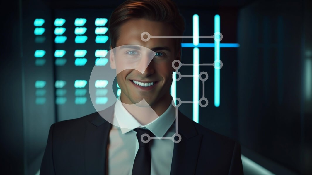 Υπάρχει δυνατότητα προσωποποίησης με δική σας φωτογραφία και προσαρμογής διαστάσεων κατόπιν παραγγελίας. Το συγεκεριμενο puzzle παρουσιαζει Η εικόνα παρουσιάζει ένα ψηφιακά αποδοθέν πορτρέτο ενός ελκυστικού νεαρού άνδρα, ο οποίος φαίνεται να χαμογελά στο βάθος. Είναι ντυμένος με μαύρο κοστούμι και γραβάτα, με το πουκάμισό του κουμπωμένο και τη γραβάτα δεμένη τακτοποιημένα στο λαιμό. Υπάρχουν πολλά φώτα που περιβάλ