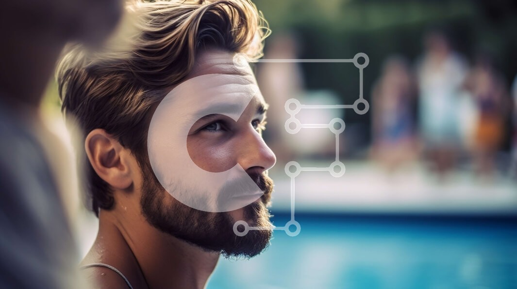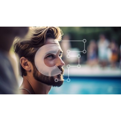 Υπάρχει δυνατότητα προσωποποίησης με δική σας φωτογραφία και προσαρμογής διαστάσεων κατόπιν παραγγελίας. Το συγεκεριμενο puzzle παρουσιαζει Αυτή η εικόνα δείχνει έναν άνδρα με γένια και τατουάζ στο λαιμό του, να στέκεται δίπλα σε μια μπλε πισίνα και να κοιτάζει μακριά. Ο άντρας είναι ντυμένος με casual ρούχα και δείχνει χαλαρός και στοχαστικός. Το φόντο είναι θολό, γεγονός που βοηθά να τραβήξετε την προσοχή στον ά