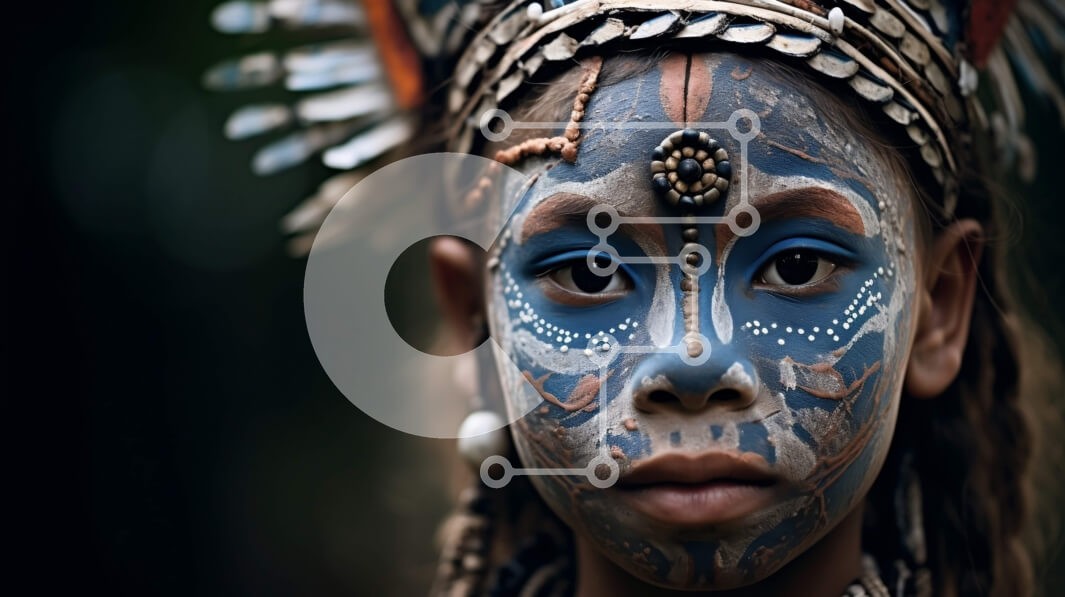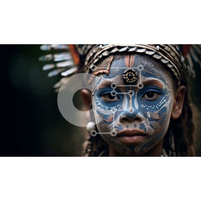 Υπάρχει δυνατότητα προσωποποίησης με δική σας φωτογραφία και προσαρμογής διαστάσεων κατόπιν παραγγελίας. Το συγεκεριμενο puzzle παρουσιαζει Αυτή η εικόνα απεικονίζει ένα άτομο που φοράει παραδοσιακή φυλετική βαφή προσώπου, με περίπλοκα μπλε και λευκά μοτίβα που κοσμούν το πρόσωπο και τα μπράτσα του. Είναι στολισμένα με ένα πουπουλένιο κόμμωμα στο κεφάλι τους και ένα περιδέραιο με μια μεγάλη χάντρα. Το άτομο κοιτάζ