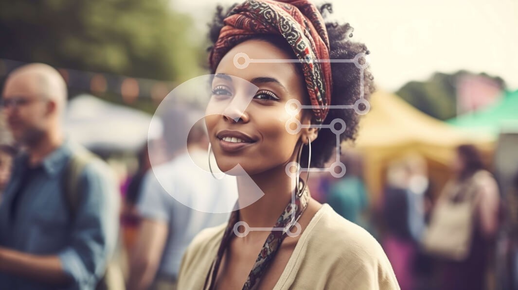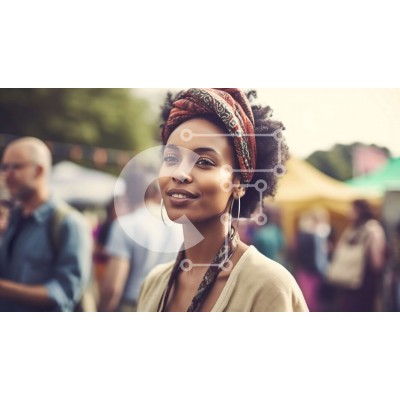 Υπάρχει δυνατότητα προσωποποίησης με δική σας φωτογραφία και προσαρμογής διαστάσεων κατόπιν παραγγελίας. Το συγεκεριμενο puzzle παρουσιαζει Αυτή η εικόνα δείχνει μια νεαρή γυναίκα με άφρο χτένισμα, φορώντας ένα πολύχρωμο τουρμπάνι και μεγάλα σκουλαρίκια με κρίκους να στέκεται μπροστά σε ένα πλήθος ανθρώπων σε μια υπαίθρια αγορά ή φεστιβάλ. Το φόντο είναι γεμάτο με πολύχρωμες σκηνές και πάγκους που πουλάνε διάφορα