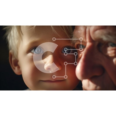 Υπάρχει δυνατότητα προσωποποίησης με δική σας φωτογραφία και προσαρμογής διαστάσεων κατόπιν παραγγελίας. Το συγεκεριμενο puzzle παρουσιαζει Αυτή η εικόνα απαθανατίζει ένα κοντινό πλάνο ενός παιδιού και ενός μεγαλύτερου ενήλικα, πιθανώς ενός παππού και της γιαγιάς, που μοιράζονται μια στιγμή μαζί. Τα φωτεινά μπλε μάτια του παιδιού διακρίνονται σε περίοπτη θέση, αντανακλώντας ένα φως που υποδηλώνει ζεστασιά και αθωό