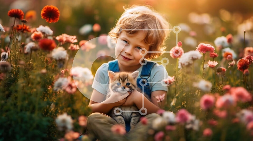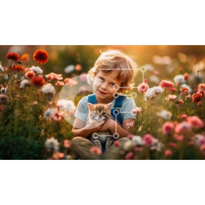 Υπάρχει δυνατότητα προσωποποίησης με δική σας φωτογραφία και προσαρμογής διαστάσεων κατόπιν παραγγελίας. Το συγεκεριμενο puzzle παρουσιαζει Αυτή η εικόνα παρουσιάζει ένα νεαρό αγόρι που φοράει φόρμες και ένα τζιν πουκάμισο, κάθεται σε ένα χωράφι με πολύχρωμα αγριολούλουδα. Το αγόρι έχει σγουρά μαλλιά και κρατά στην αγκαλιά του ένα μικρό, χνουδωτό γατάκι. Ο ουρανός είναι καταγάλανος και η συνολική διάθεση της εικόν