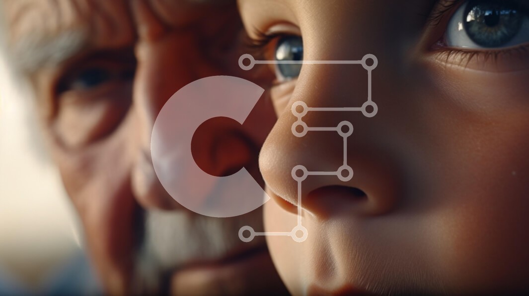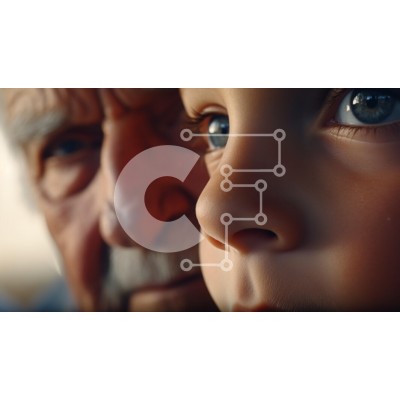 Υπάρχει δυνατότητα προσωποποίησης με δική σας φωτογραφία και προσαρμογής διαστάσεων κατόπιν παραγγελίας. Το συγεκεριμενο puzzle παρουσιαζει Η εικόνα παρουσιάζει ένα κοντινό πλάνο με τα πρόσωπα ενός παιδιού και ενός ηλικιωμένου. Τα μπλε μάτια του παιδιού είναι λαμπερά και εκφραστικά, αντανακλούν την αθωότητα και την περιέργεια, ενώ το πρόσωπο του μεγαλύτερου σημειώνεται με την ηλικία, δείχνοντας βαθιές γραμμές και