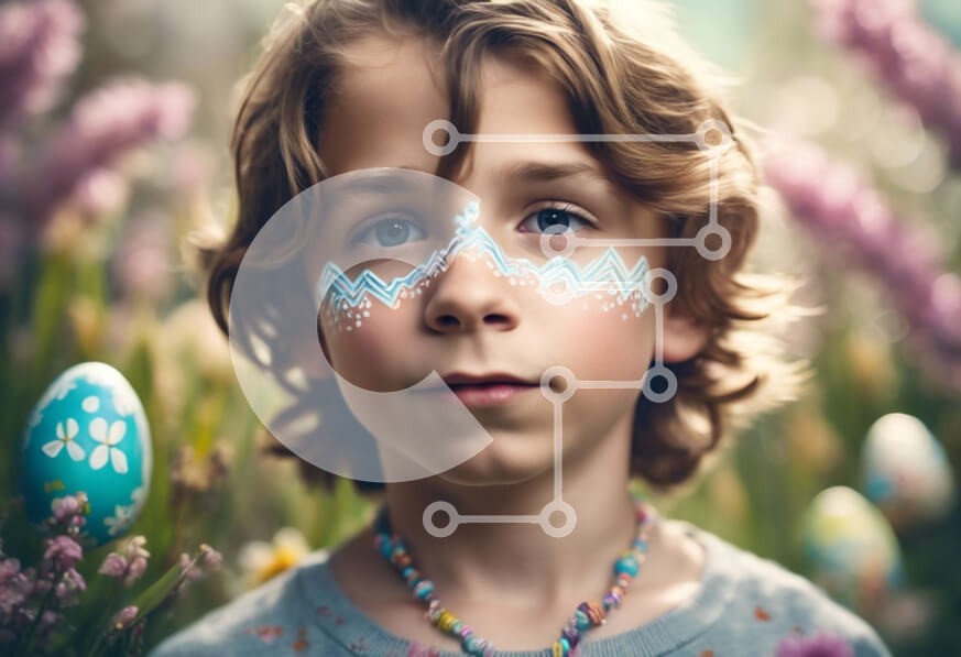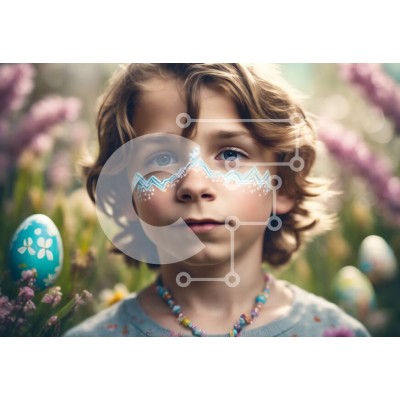Υπάρχει δυνατότητα προσωποποίησης με δική σας φωτογραφία και προσαρμογής διαστάσεων κατόπιν παραγγελίας. Το συγεκεριμενο puzzle παρουσιαζει Αυτή η εικόνα παρουσιάζει ένα νεαρό αγόρι με μπογιά στο πρόσωπο και πασχαλινά αυγά ζωγραφισμένα στο πρόσωπό του να στέκεται στη μέση ενός χωραφιού με λουλούδια. Το πρόσωπο του αγοριού φαίνεται να έχει καεί ελαφρά από τον ήλιο, πιθανώς λόγω του έντονου φωτός. Ένα μοναδικό puzz