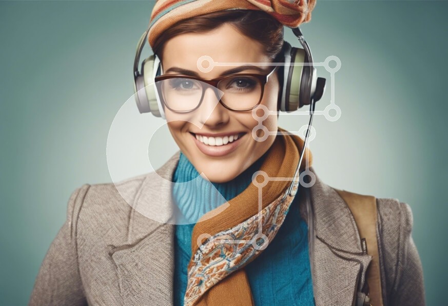 Υπάρχει δυνατότητα προσωποποίησης με δική σας φωτογραφία και προσαρμογής διαστάσεων κατόπιν παραγγελίας. Το συγεκεριμενο puzzle παρουσιαζει Αυτή η εικόνα παρουσιάζει μια χαμογελαστή γυναίκα που φοράει ακουστικά και γυαλιά. Φαίνεται να ακούει μουσική ή να μιλάει στο τηλέφωνο, υποδηλώνοντας τη σύνδεσή της με την οπτικοακουστική βιομηχανία. Το κασκόλ γύρω από το λαιμό της προσθέτει μια μοντέρνα πινελιά και υποδηλώνει