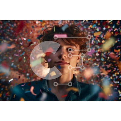 Υπάρχει δυνατότητα προσωποποίησης με δική σας φωτογραφία και προσαρμογής διαστάσεων κατόπιν παραγγελίας. Το συγεκεριμενο puzzle παρουσιαζει Αυτή η εικόνα δείχνει έναν νεαρό άνδρα να στέκεται σε ένα δωμάτιο με πολύχρωμα κομφετί να πέφτουν γύρω του. Έχει σγουρά μαλλιά και φοράει μπλε πουκάμισο. Έχει μια σοβαρή έκφραση στο πρόσωπό του και κοιτάζει κατευθείαν την κάμερα. Η εικόνα είναι ιδανική για να προσθέσετε μια δι