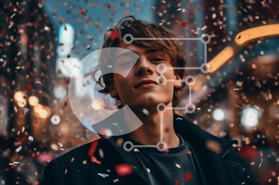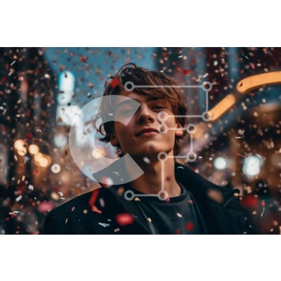 Υπάρχει δυνατότητα προσωποποίησης με δική σας φωτογραφία και προσαρμογής διαστάσεων κατόπιν παραγγελίας. Το συγεκεριμενο puzzle παρουσιαζει Αυτή η εικόνα απαθανατίζει έναν νεαρό άνδρα να στέκεται στη μέση ενός πολυσύχναστου δρόμου της πόλης με κομφετί και σερπαντίνες γύρω του. Κοιτάζει κατευθείαν την κάμερα με μια σοβαρή έκφραση στο πρόσωπό του. Το φόντο γεμίζει με πολύχρωμα κομφετί και σερπαντίνες, δημιουργώντας
