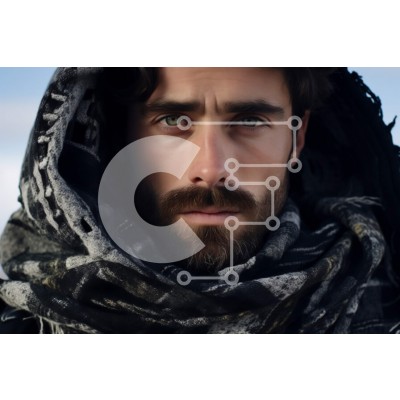 Υπάρχει δυνατότητα προσωποποίησης με δική σας φωτογραφία και προσαρμογής διαστάσεων κατόπιν παραγγελίας. Το συγεκεριμενο puzzle παρουσιαζει Αυτή η εικόνα απεικονίζει έναν σοβαρό άνδρα με γένια και μακριά μαλλιά, που φορά μαύρο κασκόλ και κουκούλα. Κοιτάζει κατευθείαν την κάμερα με έντονο βλέμμα. Το φόντο αποτελείται από ένα βραχώδες έδαφος με βουνά σε απόσταση. Ένα μοναδικό puzzle που συνδυάζει ποιότητα, αισθητικ
