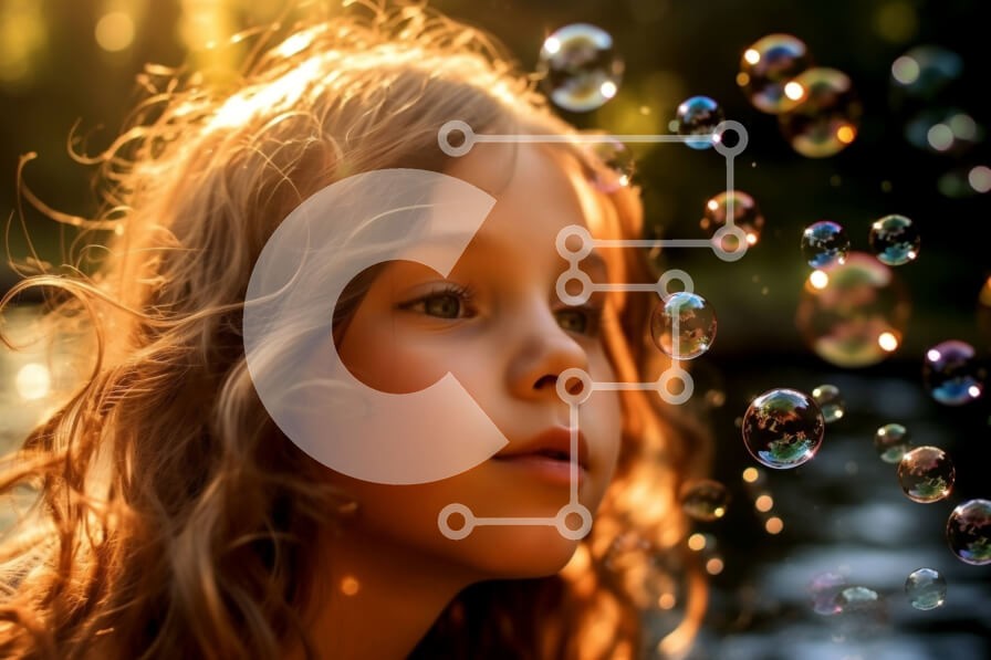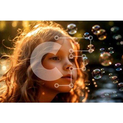 Υπάρχει δυνατότητα προσωποποίησης με δική σας φωτογραφία και προσαρμογής διαστάσεων κατόπιν παραγγελίας. Το συγεκεριμενο puzzle παρουσιαζει Αυτή η εικόνα απαθανατίζει ένα νεαρό κορίτσι που στέκεται μπροστά σε ένα σώμα νερού, κοιτάζοντας ψηλά τις φυσαλίδες που φωτίζονται από τον ήλιο που δύει. Το κορίτσι φοράει ροζ πουκάμισο και σορτς και έχει μακριά σγουρά μαλλιά. Ο ήλιος δύει πίσω της, ρίχνοντας μια ζεστή λάμψη σ