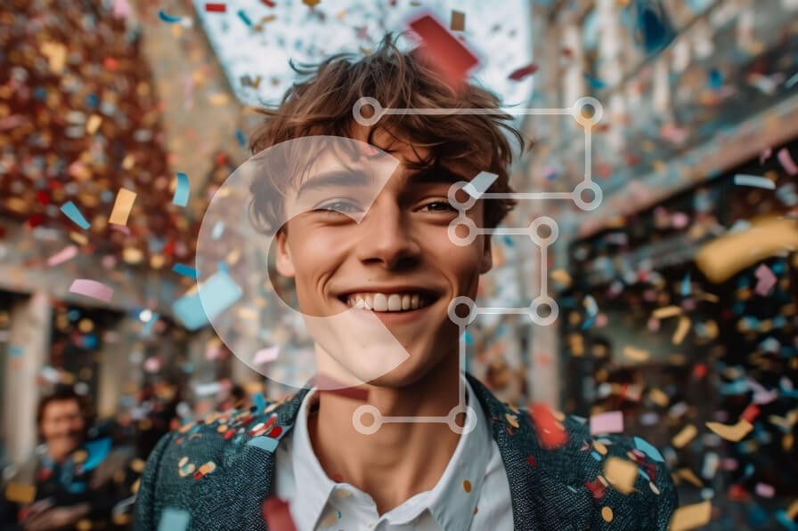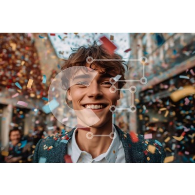 Υπάρχει δυνατότητα προσωποποίησης με δική σας φωτογραφία και προσαρμογής διαστάσεων κατόπιν παραγγελίας. Το συγεκεριμενο puzzle παρουσιαζει Αυτή η εικόνα παρουσιάζει έναν νεαρό άνδρα με κοστούμι και γραβάτα να στέκεται στη μέση ενός πολυσύχναστου δρόμου, περιτριγυρισμένος από κομφετί και ένα πλήθος ανθρώπων που γιορτάζουν. Χαμογελάει και κοιτάζει κατευθείαν την κάμερα. Το φόντο είναι γεμάτο με πολύχρωμα κομφετί κα