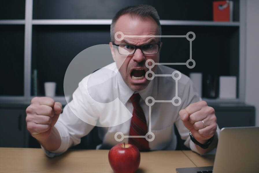 Υπάρχει δυνατότητα προσωποποίησης με δική σας φωτογραφία και προσαρμογής διαστάσεων κατόπιν παραγγελίας. Το συγεκεριμενο puzzle παρουσιαζει Η εικόνα απεικονίζει έναν άνδρα με γυαλιά και ένα μήλο στο χέρι. Φαίνεται να είναι θυμωμένος ή απογοητευμένος, πιθανώς λόγω του γεγονότος ότι είναι αναστατωμένος για κάτι που συμβαίνει γύρω του. Υπάρχουν αρκετοί φορητοί υπολογιστές στο τραπέζι, που μπορεί να υποδηλώνουν ότι ο