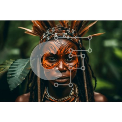 Υπάρχει δυνατότητα προσωποποίησης με δική σας φωτογραφία και προσαρμογής διαστάσεων κατόπιν παραγγελίας. Το συγεκεριμενο puzzle παρουσιαζει Αυτή η εικόνα παρουσιάζει μια γυναίκα με φυλετική βαφή προσώπου και φτερά στα μαλλιά της. Φοράει κολιέ και σκουλαρίκια και έχει σοβαρή έκφραση στο πρόσωπό της. Η φωτογραφία είναι ένα κοντινό πλάνο του προσώπου και του πάνω μέρος του σώματός της, με απλό φόντο. Ένα μοναδικό pu