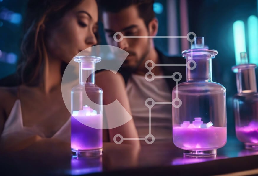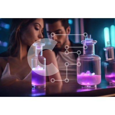 Υπάρχει δυνατότητα προσωποποίησης με δική σας φωτογραφία και προσαρμογής διαστάσεων κατόπιν παραγγελίας. Το συγεκεριμενο puzzle παρουσιαζει Αυτή η εικόνα δείχνει έναν άνδρα και μια γυναίκα να κάθονται μαζί μπροστά από τρία γυάλινα βάζα γεμάτα με χρωματιστούς κύβους. Υπάρχουν επίσης δύο μικρά μπουκάλια εκατέρωθεν του τραπεζιού. Το ζευγάρι αρραβωνιάζεται σε μια ρομαντική στιγμή, κοιτάζοντας ο ένας τον άλλον στα μάτι
