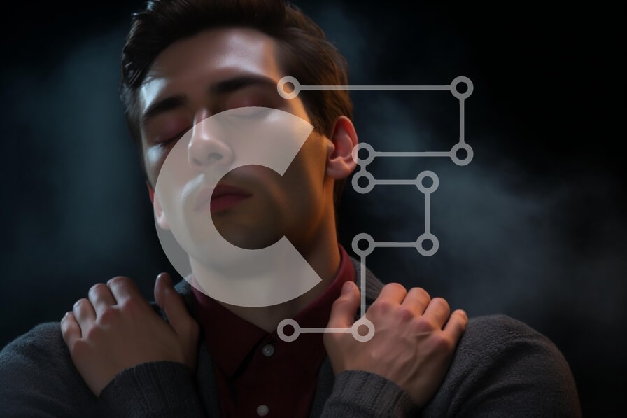 Υπάρχει δυνατότητα προσωποποίησης με δική σας φωτογραφία και προσαρμογής διαστάσεων κατόπιν παραγγελίας. Το συγεκεριμενο puzzle παρουσιαζει Η εικόνα απεικονίζει έναν νεαρό άνδρα με κλειστά μάτια, που αποπνέει μια αίσθηση ηρεμίας και ενδοσκόπησης. Είναι ντυμένος με μια σκούρα γκρι ζακέτα πάνω από ένα βυσσινί πουκάμισο, κρατώντας τους ώμους του με τα δύο χέρια. Το φόντο είναι σκοτεινό με απαλό καπνό, δημιουργώντας μ