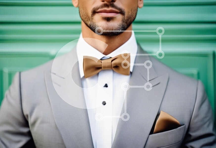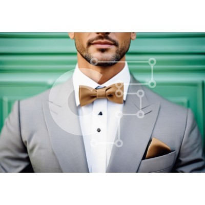 Υπάρχει δυνατότητα προσωποποίησης με δική σας φωτογραφία και προσαρμογής διαστάσεων κατόπιν παραγγελίας. Το συγεκεριμενο puzzle παρουσιαζει Αυτή η εικόνα παρουσιάζει έναν καλοντυμένο άνδρα που φορά ένα γκρι κοστούμι και σμόκιν. Στέκεται μπροστά σε πράσινες πόρτες, υποδεικνύοντας πιθανώς ένα σημαντικό γεγονός ή περίσταση. Η ενδυμασία του αποπνέει κομψότητα, με εμφανές καφέ παπιγιόν στην αριστερή πλευρά. Η εικόνα εί