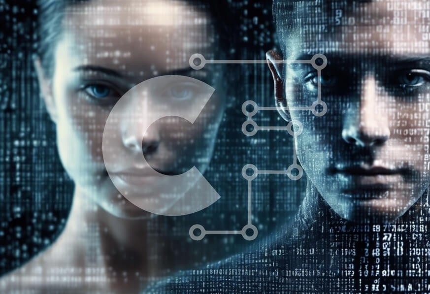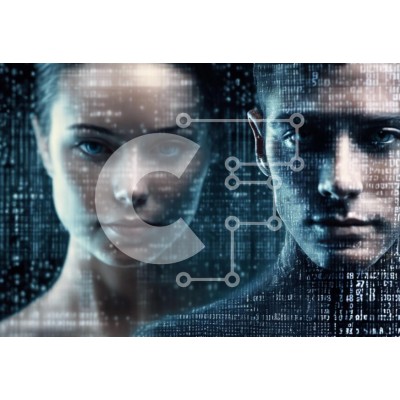 Υπάρχει δυνατότητα προσωποποίησης με δική σας φωτογραφία και προσαρμογής διαστάσεων κατόπιν παραγγελίας. Το συγεκεριμενο puzzle παρουσιαζει Αυτή η εικόνα παρουσιάζει έναν άνδρα και μια γυναίκα που στέκονται μπροστά από ένα αφηρημένο ψηφιακό φόντο. Το πρόσωπο του άνδρα κοιτάζει κατευθείαν την κάμερα, ενώ η γυναίκα έχει το κεφάλι της γερμένο ελαφρά στο πλάι. Μεταφέρει μια αίσθηση σύνδεσης μεταξύ των δύο ατόμων, πιθα