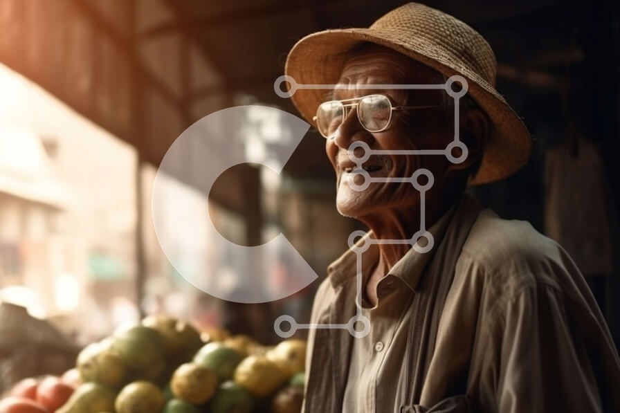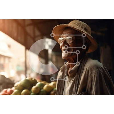 Υπάρχει δυνατότητα προσωποποίησης με δική σας φωτογραφία και προσαρμογής διαστάσεων κατόπιν παραγγελίας. Το συγεκεριμενο puzzle παρουσιαζει Αυτή η στοκ φωτογραφία δείχνει έναν ηλικιωμένο άνδρα που φοράει ψάθινο καπέλο και γυαλιά ηλίου να στέκεται μπροστά από ένα πάγκο φρούτων σε μια πολύβουη αγορά. Ο άντρας έχει μια σοβαρή έκφραση και κοιτάζει μακριά. Το περίπτερο είναι γεμάτο με διάφορα φρούτα όπως πορτοκάλια, λε