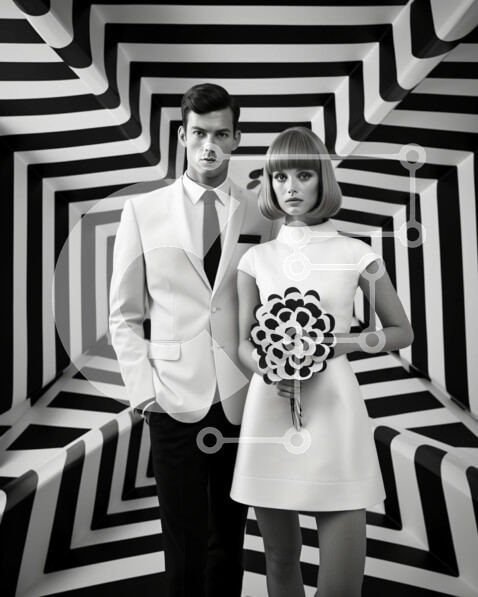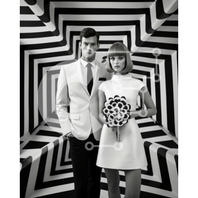 Υπάρχει δυνατότητα προσωποποίησης με δική σας φωτογραφία και προσαρμογής διαστάσεων κατόπιν παραγγελίας. Το συγεκεριμενο puzzle παρουσιαζει Αυτή η ασπρόμαυρη εικόνα παρουσιάζει έναν άνδρα και μια γυναίκα ντυμένους με επίσημη ενδυμασία να στέκονται στη μέση ενός αφηρημένου σχεδίου. Το ζευγάρι ποζάρει μπροστά στο μοτίβο, απαθανατίζοντας μια ιδιαίτερη στιγμή που μπορεί να υποδηλώνει γάμο ή αρραβώνα. Η χαρά και η κομψ