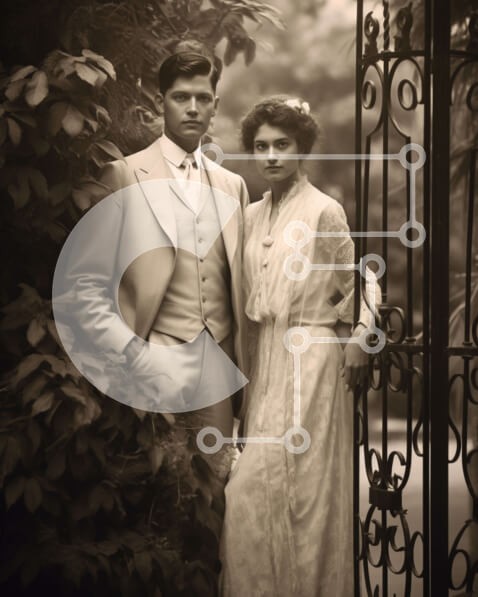 Υπάρχει δυνατότητα προσωποποίησης με δική σας φωτογραφία και προσαρμογής διαστάσεων κατόπιν παραγγελίας. Το συγεκεριμενο puzzle παρουσιαζει Στην εικόνα απεικονίζονται ένας άνδρας και μια γυναίκα ντυμένοι με επίσημη ενδυμασία να στέκονται δίπλα σε μια περίτεχνη πύλη. Ποζάρουν στον φωτογραφικό φακό, με τα χέρια ακουμπισμένα στους γοφούς τους. Υπάρχει κάποιο φύλλωμα γύρω από το ζευγάρι, το οποίο μπορεί να υποδηλώνει