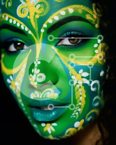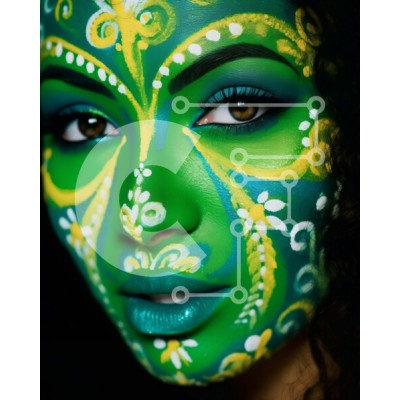 Υπάρχει δυνατότητα προσωποποίησης με δική σας φωτογραφία και προσαρμογής διαστάσεων κατόπιν παραγγελίας. Το συγεκεριμενο puzzle παρουσιαζει Αυτή η φωτογραφία δείχνει μια γυναίκα με μια πράσινη και κίτρινη ζωγραφική προσώπου. Τα χρώματα που χρησιμοποιούνται στον πίνακα είναι φωτεινά και τολμηρά, δημιουργώντας ένα εντυπωσιακό αποτέλεσμα. Η γυναίκα κοιτάζει κατευθείαν την κάμερα και η έκφρασή της είναι ήρεμη και γαλή