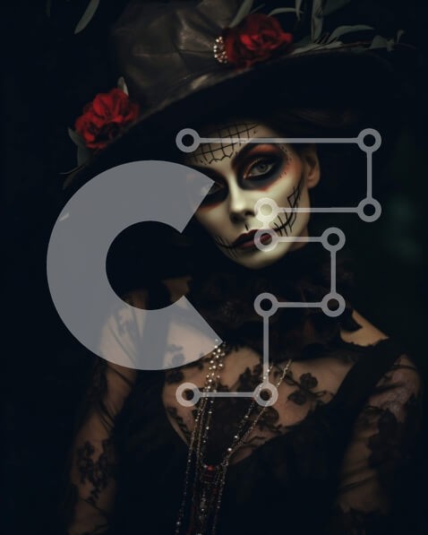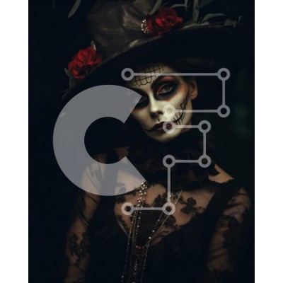 Υπάρχει δυνατότητα προσωποποίησης με δική σας φωτογραφία και προσαρμογής διαστάσεων κατόπιν παραγγελίας. Το συγεκεριμενο puzzle παρουσιαζει Αυτή η φωτογραφία απεικονίζει μια γυναίκα ντυμένη με ασπρόμαυρη στολή σκελετού με μαύρο καπέλο στολισμένο με κόκκινα τριαντάφυλλα. Έχει περίπλοκο μακιγιάζ στο κρανίο στο πρόσωπό της, το οποίο ταιριάζει απόλυτα με το ντύσιμό της. Στέκεται σε σκούρο φόντο, που την κάνει να ξεχωρ