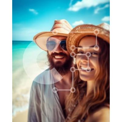 Υπάρχει δυνατότητα προσωποποίησης με δική σας φωτογραφία και προσαρμογής διαστάσεων κατόπιν παραγγελίας. Το συγεκεριμενο puzzle παρουσιαζει Αυτή η εικόνα παρουσιάζει ένα ζευγάρι που στέκεται σε μια αμμώδη παραλία. Ο άνδρας φαίνεται να είναι γύρω στα τριάντα με μούσι και μουστάκι, ενώ η γυναίκα είναι στα είκοσι και φοράει μπικίνι και γυαλιά ηλίου. Και οι δύο χαμογελούν και κοιτούν την κάμερα, απολαμβάνοντας την ηλι
