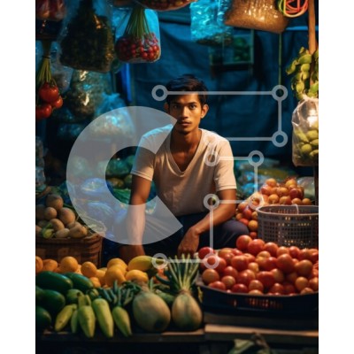 Υπάρχει δυνατότητα προσωποποίησης με δική σας φωτογραφία και προσαρμογής διαστάσεων κατόπιν παραγγελίας. Το συγεκεριμενο puzzle παρουσιαζει Αυτή η εικόνα απεικονίζει έναν άνδρα να κάθεται μπροστά από μια έκθεση με φρούτα και λαχανικά σε έναν πάγκο αγοράς. Φοράει λευκό πουκάμισο και έχει μια σοβαρή έκφραση στο πρόσωπό του. Το φόντο είναι αμυδρά φωτισμένο, δημιουργώντας μια ζεστή ατμόσφαιρα. Άλλοι πάγκοι της αγοράς