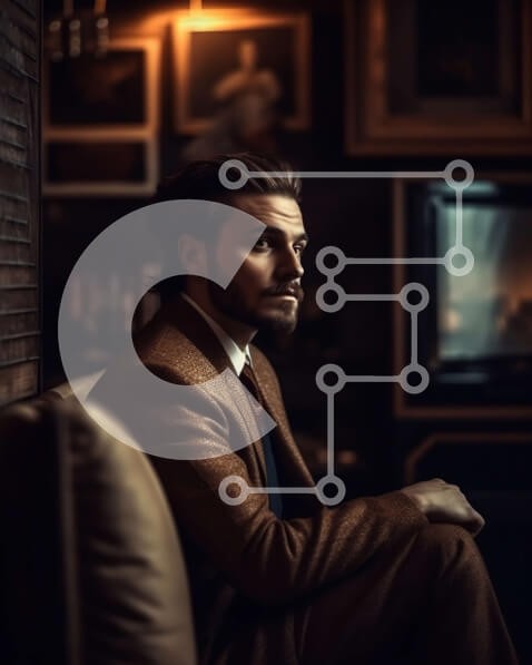 Υπάρχει δυνατότητα προσωποποίησης με δική σας φωτογραφία και προσαρμογής διαστάσεων κατόπιν παραγγελίας. Το συγεκεριμενο puzzle παρουσιαζει Αυτή η φωτογραφία δείχνει έναν άνδρα που φορά ένα καφέ κοστούμι και γραβάτα, καθισμένος σε έναν καναπέ σε ένα δωμάτιο με χαμηλό φωτισμό. Κοιτάζει μακριά, χαμένος στις σκέψεις του. Η εικόνα προκαλεί μια αίσθηση μοναξιάς και περισυλλογής. Ένα μοναδικό puzzle που συνδυάζει ποιότ