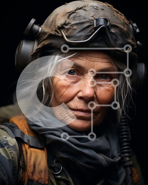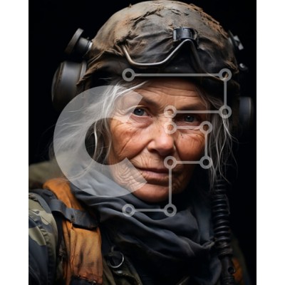 Υπάρχει δυνατότητα προσωποποίησης με δική σας φωτογραφία και προσαρμογής διαστάσεων κατόπιν παραγγελίας. Το συγεκεριμενο puzzle παρουσιαζει Αυτή είναι μια φωτογραφία πορτρέτου μιας ηλικιωμένης γυναίκας που φοράει κράνος και γυαλιά. Έχει ρυτίδες και γκρίζα μαλλιά και φαίνεται να είναι κάποιου είδους στρατιώτης ή επιζών. Η εικόνα είναι ισχυρή και μοναδική, αντιπροσωπεύει δύναμη και ανθεκτικότητα. Ένα μοναδικό puzzl