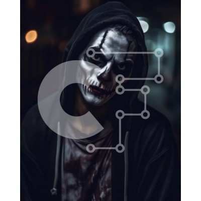 Υπάρχει δυνατότητα προσωποποίησης με δική σας φωτογραφία και προσαρμογής διαστάσεων κατόπιν παραγγελίας. Το συγεκεριμενο puzzle παρουσιαζει Αυτή η εικόνα είναι ενός άνδρα που φορά μαύρο κουκούλα και λευκή μπογιά προσώπου, που στέκεται μπροστά από έναν σκοτεινό τοίχο καλυμμένο με γκράφιτι τη νύχτα. Τα μάτια του λάμπουν πράσινα, προσθέτοντας στη μυστηριώδη ατμόσφαιρα. Η συνολική εμφάνιση είναι σκοτεινή και νευρική,