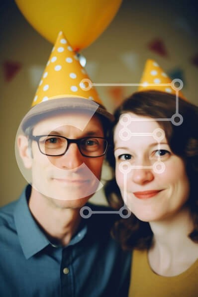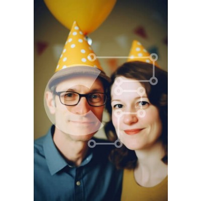 Υπάρχει δυνατότητα προσωποποίησης με δική σας φωτογραφία και προσαρμογής διαστάσεων κατόπιν παραγγελίας. Το συγεκεριμενο puzzle παρουσιαζει Αυτή η εικόνα απεικονίζει έναν άνδρα και μια γυναίκα να φορούν καπέλα για πάρτι, να στέκονται μπροστά από ένα κίτρινο και άσπρο ριγέ φόντο. Ο άνδρας φοράει γυαλιά και ένα κίτρινο πουά παπιγιόν, ενώ η γυναίκα ένα κίτρινο πουά φόρεμα. Και οι δύο χαμογελούν και κοιτάζουν την κάμε