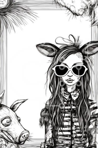 Υπάρχει δυνατότητα προσωποποίησης με δική σας φωτογραφία και προσαρμογής διαστάσεων κατόπιν παραγγελίας. Το συγεκεριμενο puzzle παρουσιαζει Η εικόνα παρουσιάζει ένα νεαρό κορίτσι που φοράει γυαλιά ηλίου και χαριτωμένα αυτιά ζώων. Στέκεται μπροστά σε ένα πλαίσιο σε σχήμα ζώου, υποδηλώνοντας μια παιχνιδιάρικη και διασκεδαστική ατμόσφαιρα. Το σκηνικό περιλαμβάνει απεικονίσεις διαφόρων ζώων όπως γουρούνια, πρόβατα και