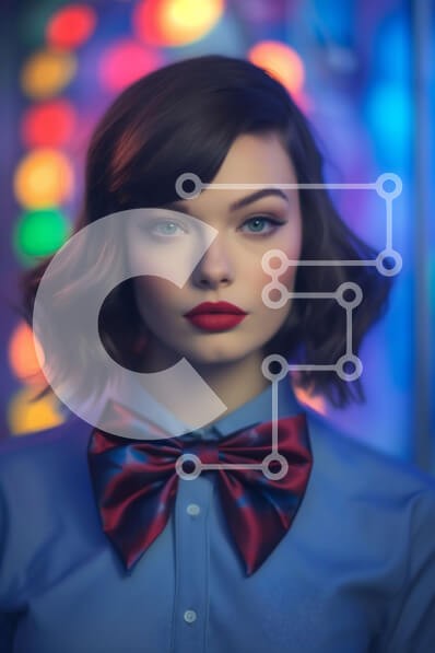 Υπάρχει δυνατότητα προσωποποίησης με δική σας φωτογραφία και προσαρμογής διαστάσεων κατόπιν παραγγελίας. Το συγεκεριμενο puzzle παρουσιαζει Αυτή η εικόνα παρουσιάζει μια γυναίκα που φορά ένα μπλε πουκάμισο και ένα κόκκινο παπιγιόν να στέκεται μπροστά σε ένα έντονα φωτισμένο φόντο με πολύχρωμα φώτα. Η γυναίκα εμφανίζεται σίγουρη και συγκροτημένη, προσθέτοντας στο συνολικό αντίκτυπο της εικόνας. Αυτή η εικόνα είναι