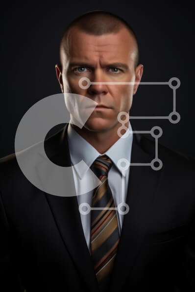 Υπάρχει δυνατότητα προσωποποίησης με δική σας φωτογραφία και προσαρμογής διαστάσεων κατόπιν παραγγελίας. Το συγεκεριμενο puzzle παρουσιαζει Η εικόνα δείχνει έναν σοβαρό άνδρα με μαύρο κοστούμι, που κοιτάζει έντονα την κάμερα. Έχει ξυρισμένο κεφάλι και ευδιάκριτα χαρακτηριστικά του προσώπου που μεταδίδουν μια αίσθηση αυτοπεποίθησης και αποφασιστικότητας. Το σκούρο φόντο ενισχύει την επίσημη ενδυμασία του και η ριγέ