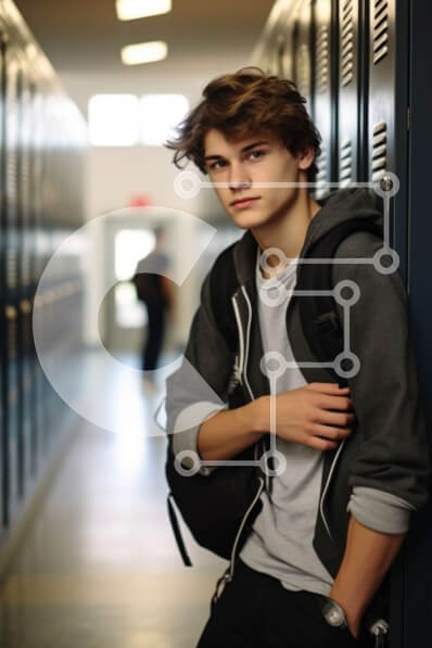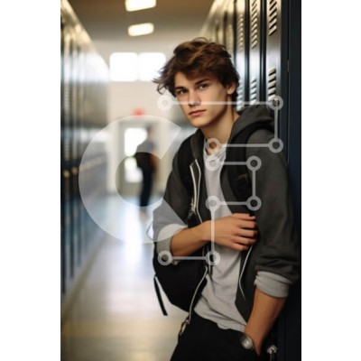 Υπάρχει δυνατότητα προσωποποίησης με δική σας φωτογραφία και προσαρμογής διαστάσεων κατόπιν παραγγελίας. Το συγεκεριμενο puzzle παρουσιαζει Αυτή η εικόνα παρουσιάζει έναν νεαρό μαθητή που ακουμπάει σε ένα ντουλάπι σε ένα σχολικό διάδρομο. Έχει ανακατωμένα μαλλιά και φοράει μια γκρι κουκούλα πάνω από ένα ελαφρύ μπλουζάκι. Το φόντο δείχνει σειρές από ντουλάπια και μια φιγούρα μαλακής εστίασης ενός άλλου μαθητή που π