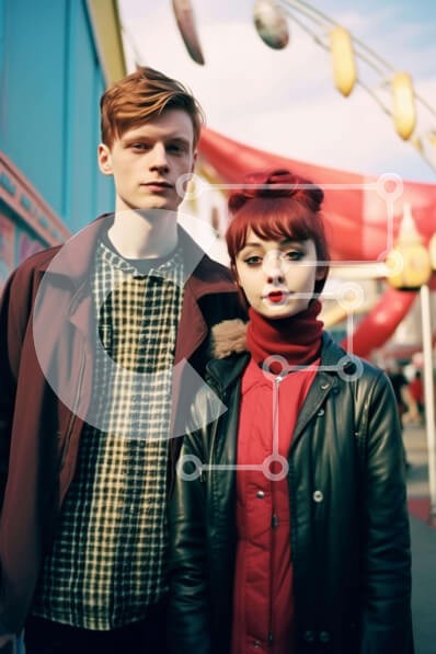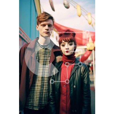 Υπάρχει δυνατότητα προσωποποίησης με δική σας φωτογραφία και προσαρμογής διαστάσεων κατόπιν παραγγελίας. Το συγεκεριμενο puzzle παρουσιαζει Η εικόνα δείχνει έναν νεαρό άνδρα και μια γυναίκα να ποζάρουν μπροστά από ένα λούνα παρκ. Φορούν κόκκινα σακάκια και ασορτί κόκκινες μπότες, υποδηλώνοντας ότι είναι ντυμένοι για την περίσταση. Αρκετές πολύχρωμες αποκριάτικες βόλτες είναι ορατές στο βάθος, υποδεικνύοντας ότι το