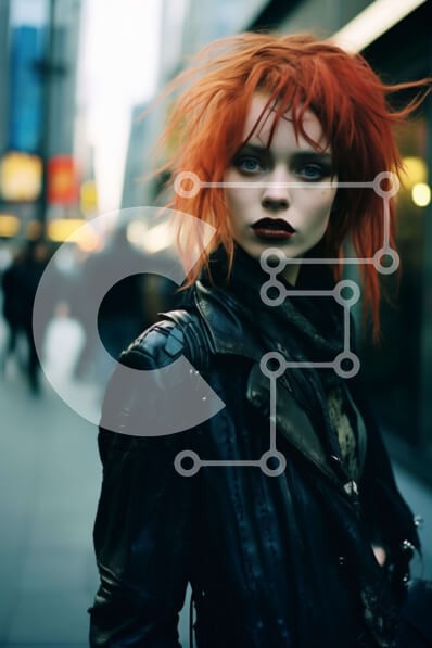 Υπάρχει δυνατότητα προσωποποίησης με δική σας φωτογραφία και προσαρμογής διαστάσεων κατόπιν παραγγελίας. Το συγεκεριμενο puzzle παρουσιαζει Η εικόνα απεικονίζει μια νεαρή γυναίκα με κόκκινα μαλλιά και μαύρο δερμάτινο μπουφάν να στέκεται στο πεζοδρόμιο μιας αστικής περιοχής. Φοράει ρούχα σε έντονα χρώματα, τα οποία ίσως είναι μέρος της πανκ ροκ εμφάνισής της. Υπάρχουν πολλά άτομα στο φόντο της εικόνας, συμπεριλαμβα