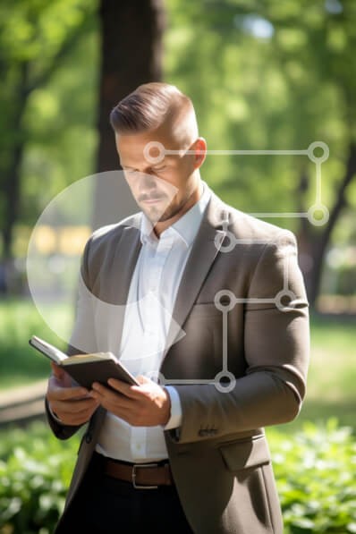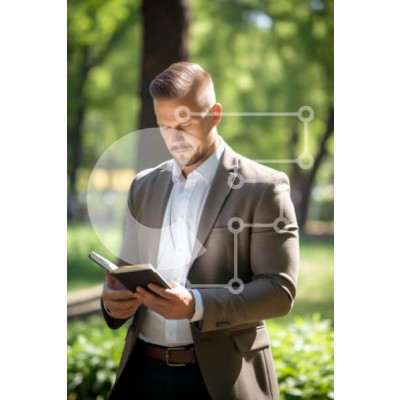 Υπάρχει δυνατότητα προσωποποίησης με δική σας φωτογραφία και προσαρμογής διαστάσεων κατόπιν παραγγελίας. Το συγεκεριμενο puzzle παρουσιαζει Η εικόνα δείχνει έναν καλοντυμένο άνδρα με μπλέιζερ και λευκό πουκάμισο, να στέκεται σε εξωτερικό χώρο σε ένα πάρκο ενώ διαβάζει ένα βιβλίο. Είναι συγκεντρωμένος και φαίνεται απορροφημένος στο περιεχόμενο του βιβλίου. Το φόντο διαθέτει πλούσια βλάστηση και δέντρα, παρέχοντας έ
